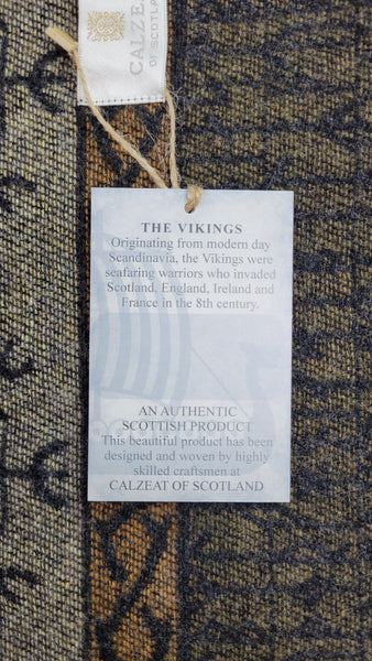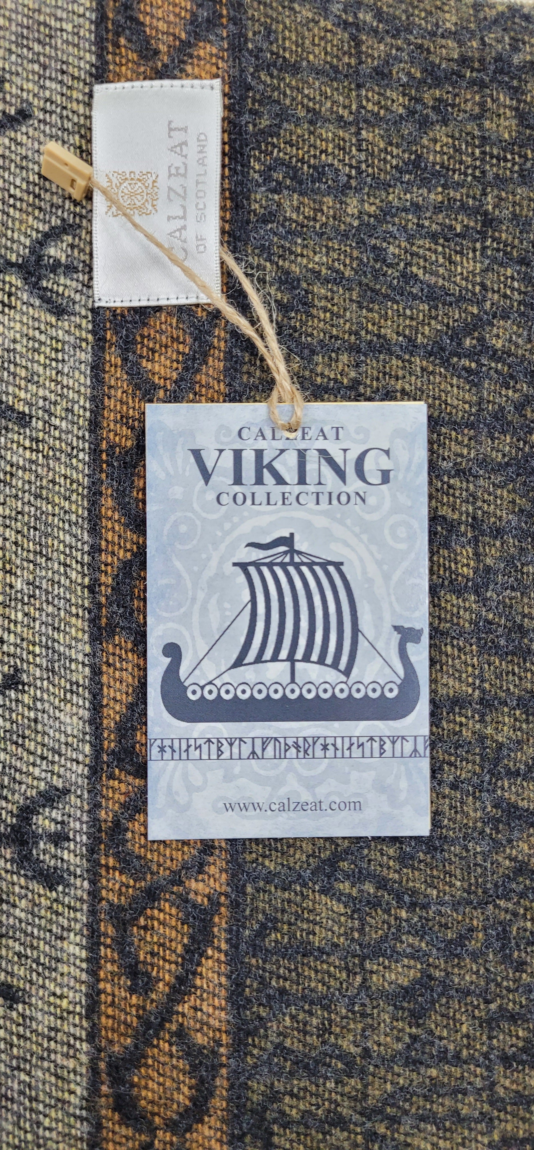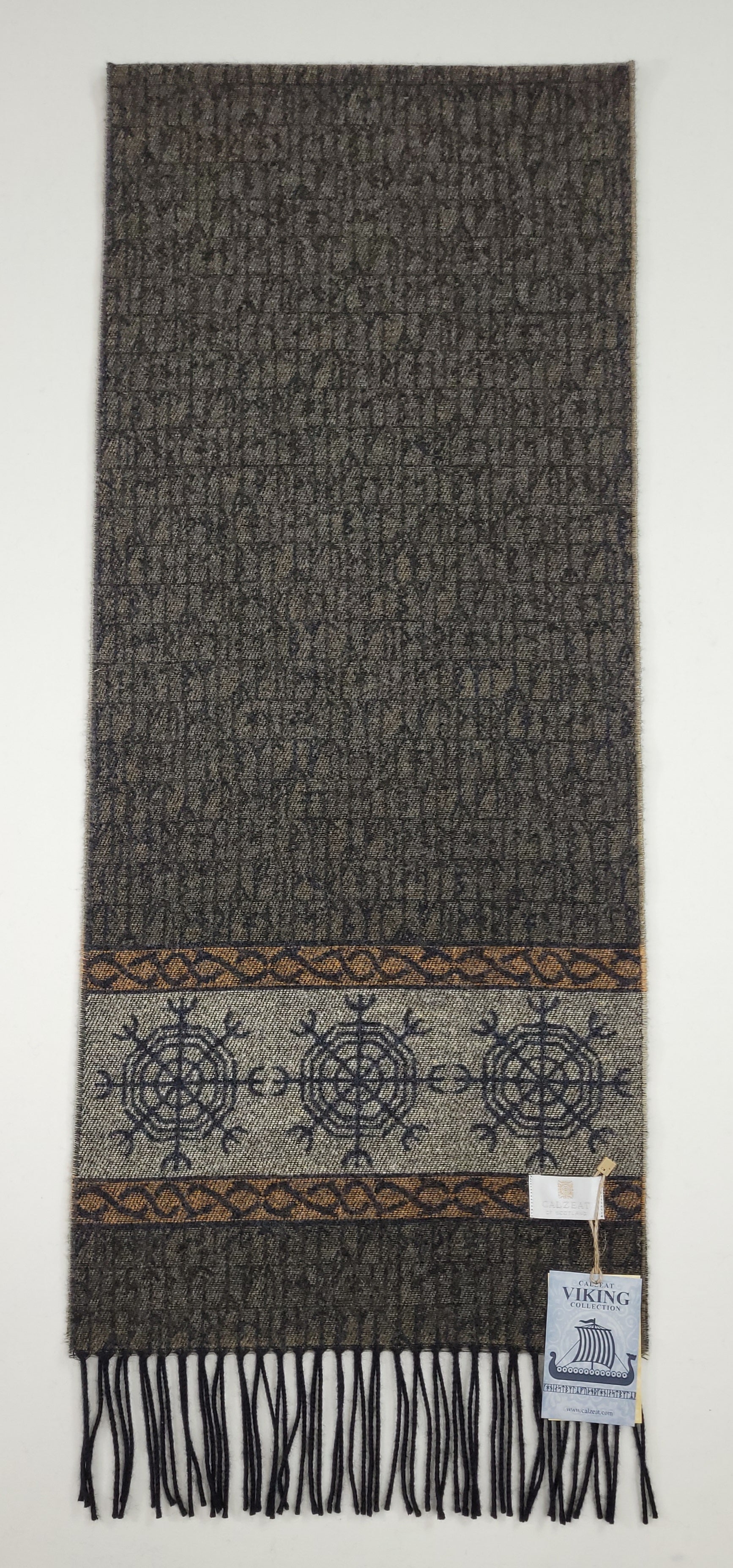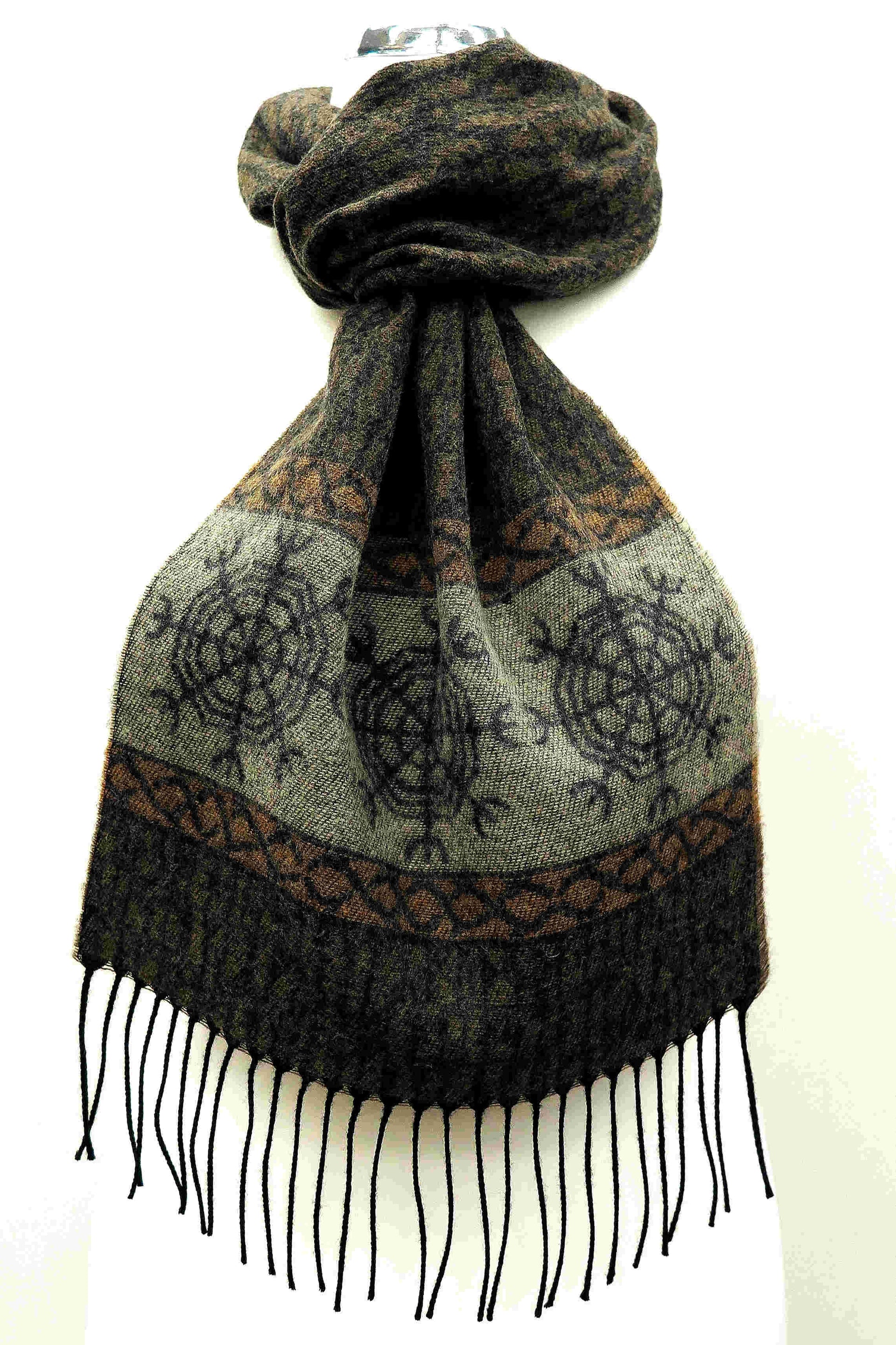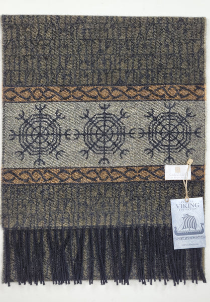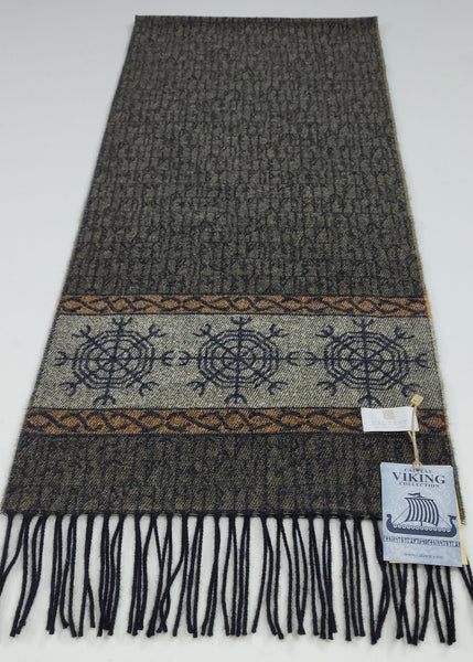 Our Viking Helm of Awe Oakwood Scarf is woven from 100% wool and the design is inspired by the powerful protective symbol used by the Vikings to protect against illness and disease.