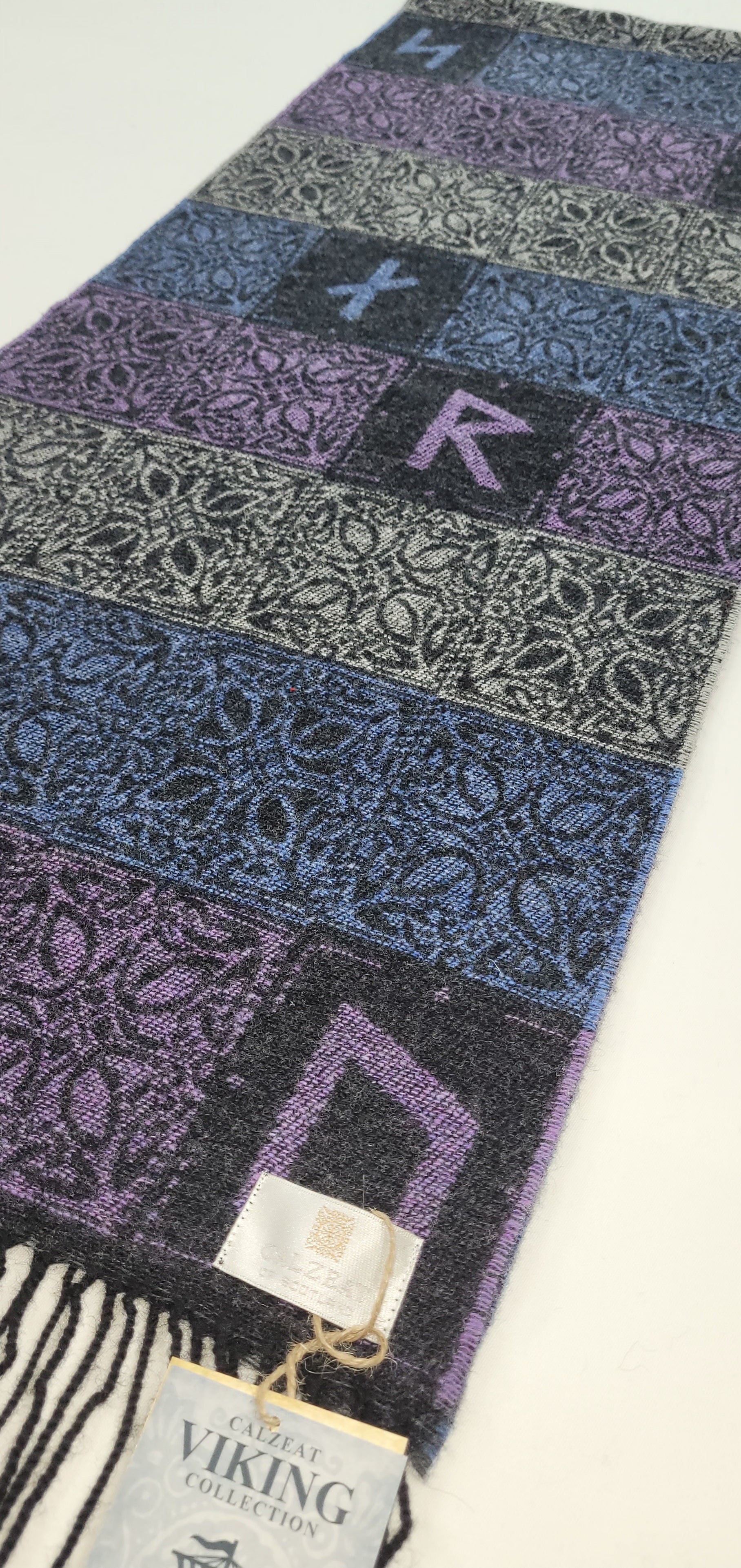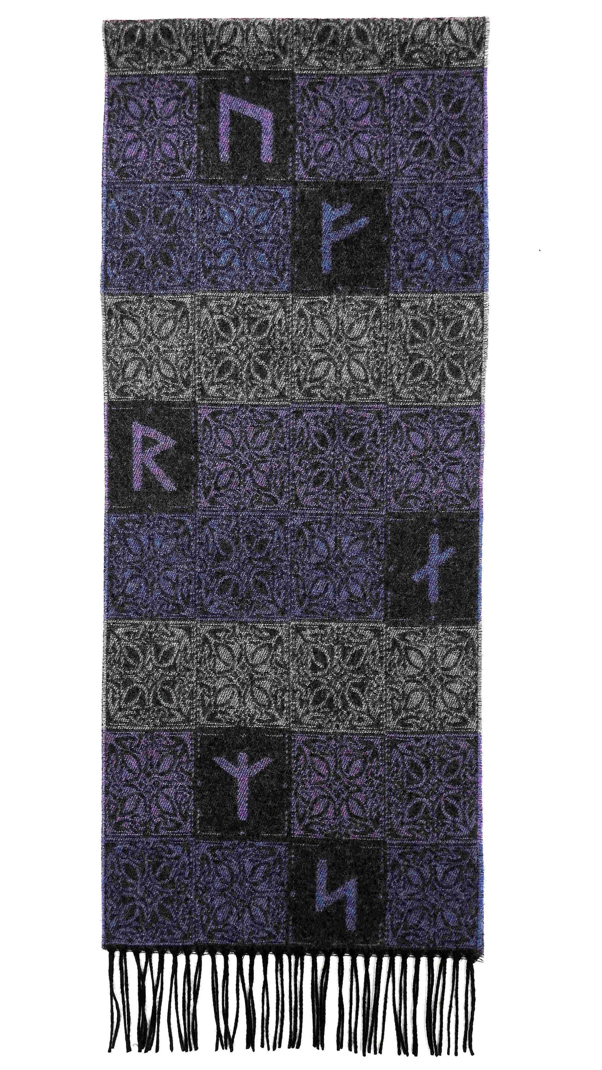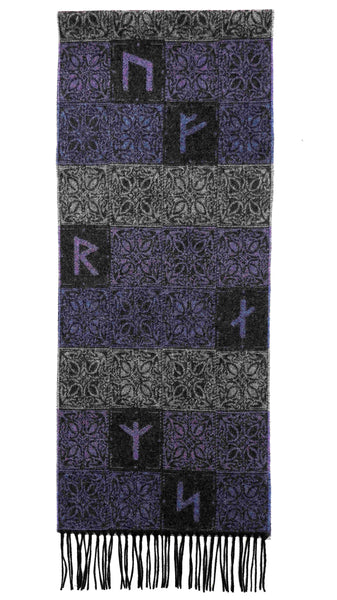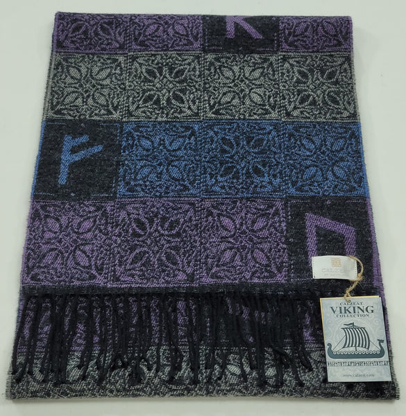 Our Viking Runes Aurora Scarf is woven from 100% wool and the block style design is inspired by the Elder Futhark Runic Alphabet used by the Vikings.
