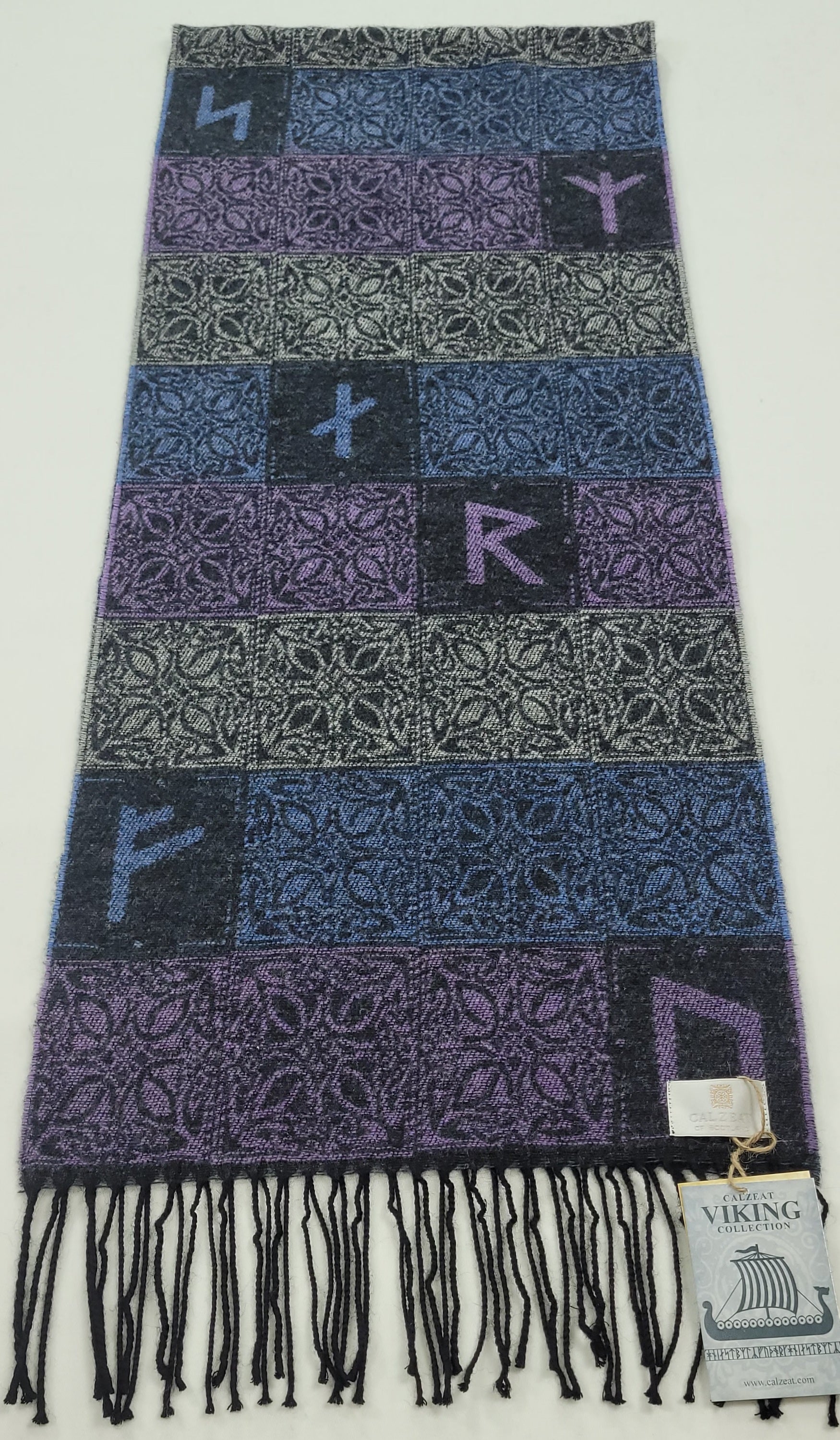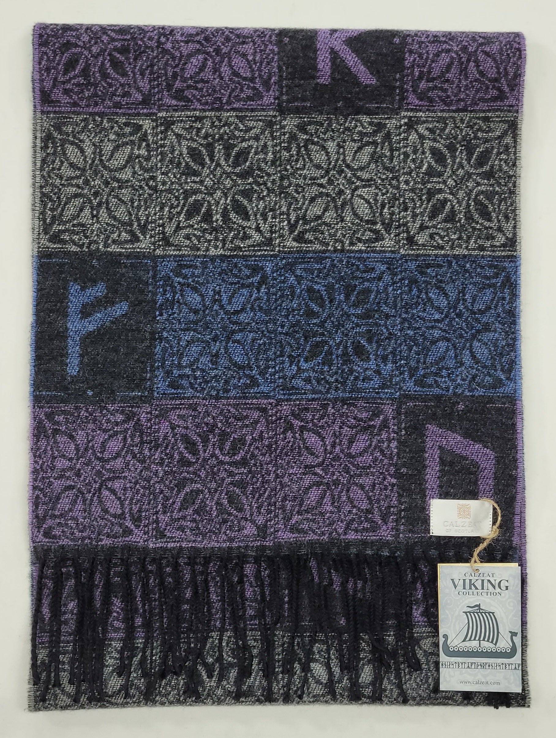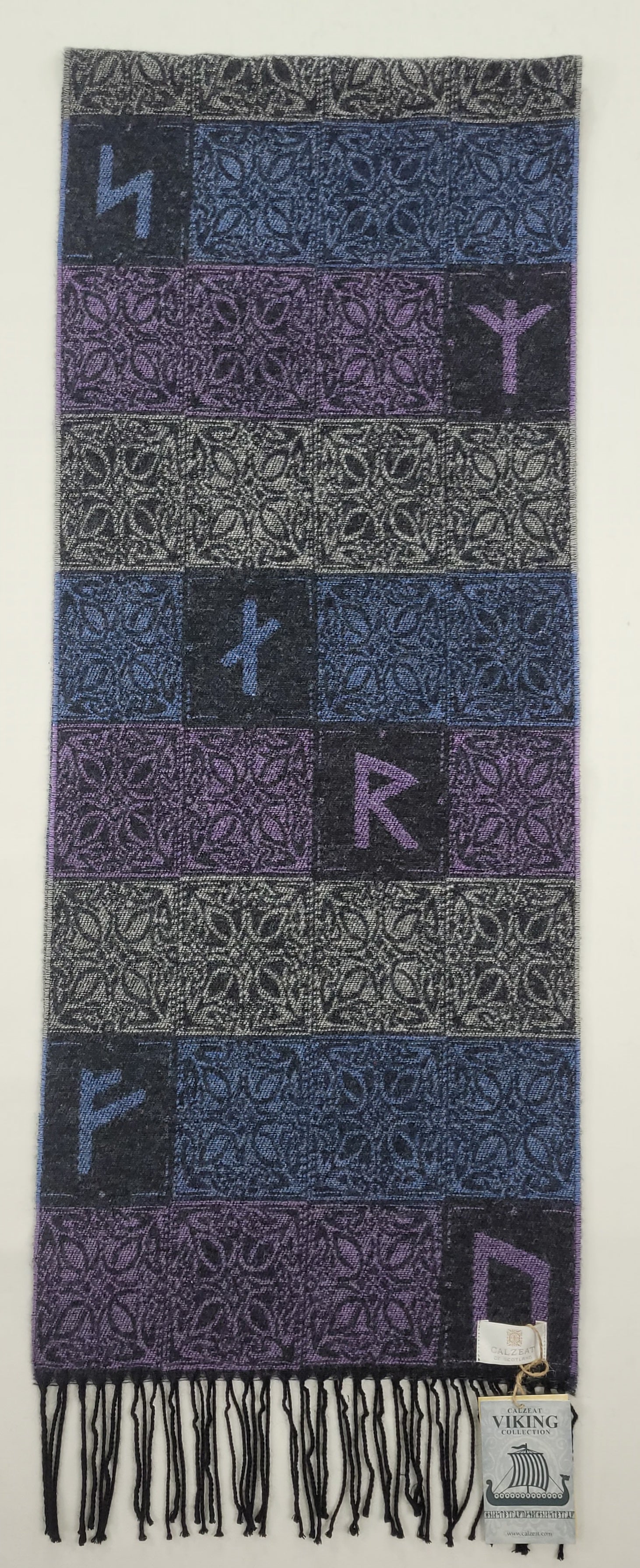 Our Viking Runes Aurora Scarf is woven from 100% wool and the block style design is inspired by the Elder Futhark Runic Alphabet used by the Vikings.