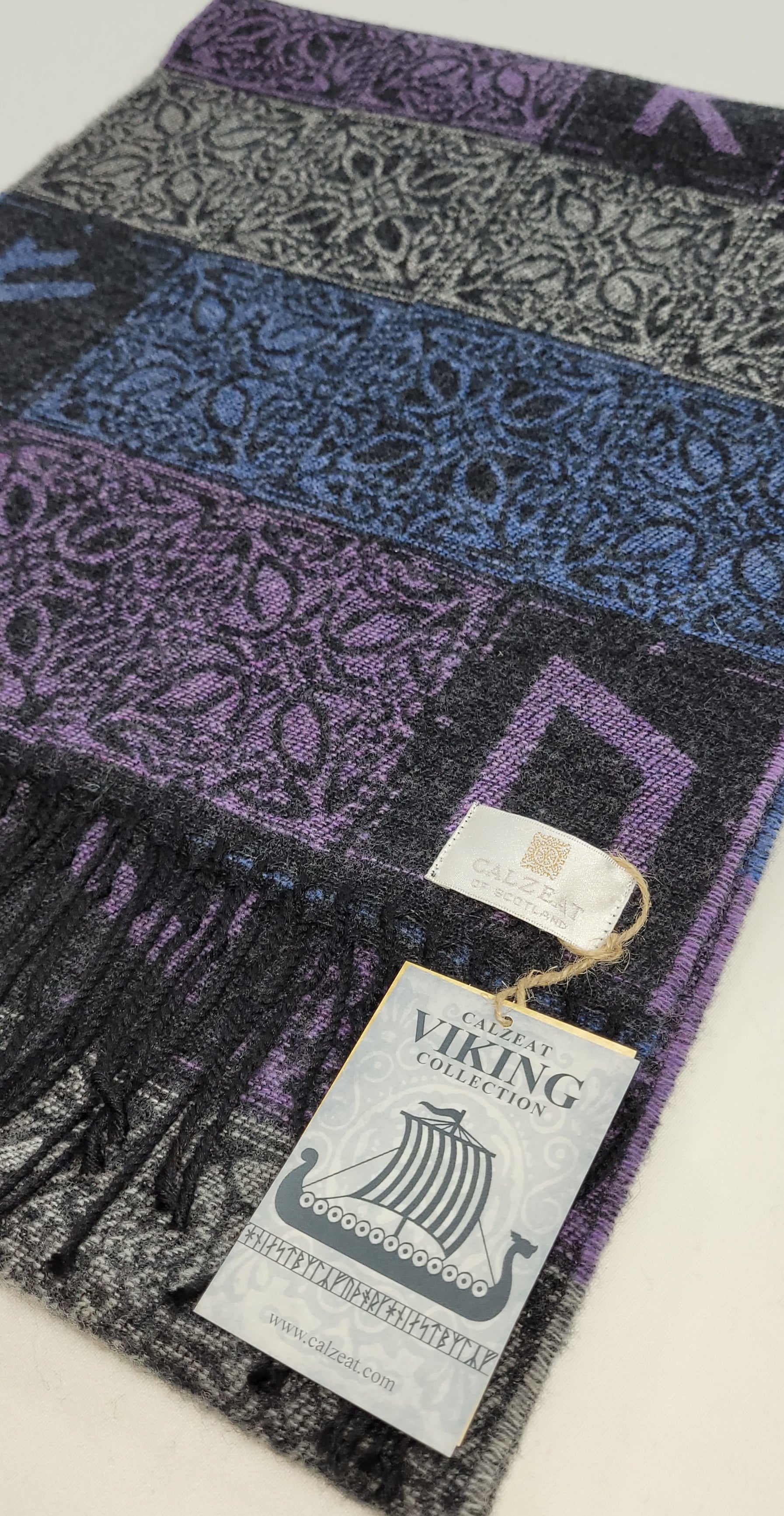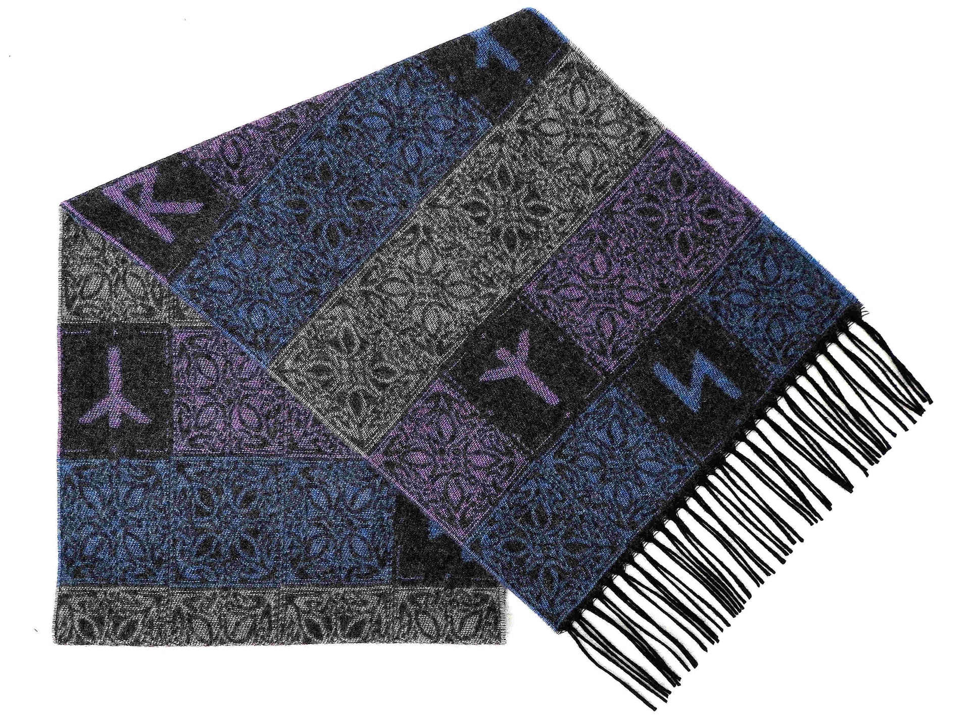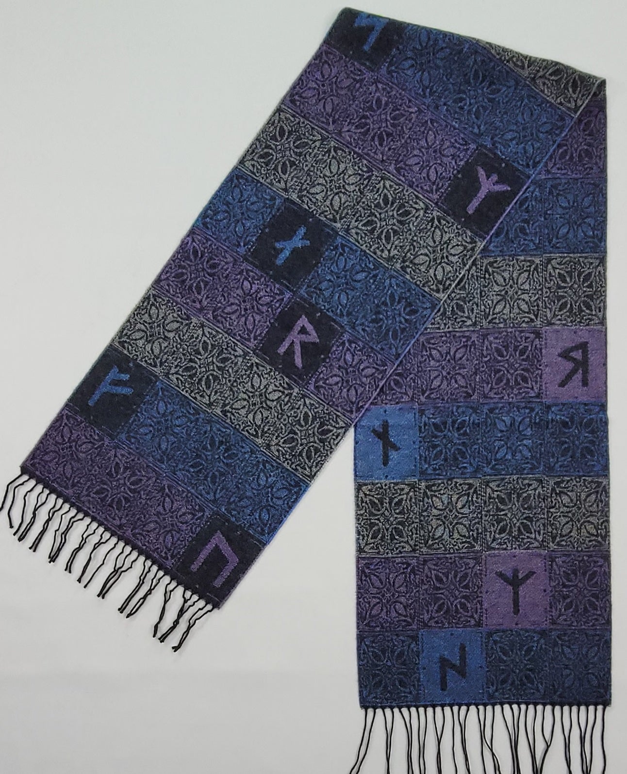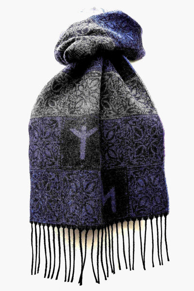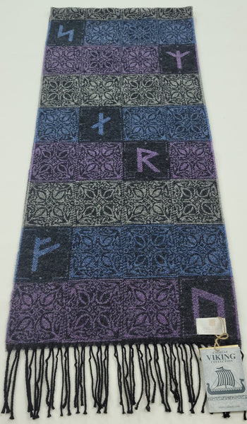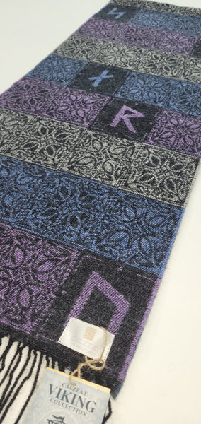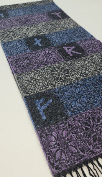 Our stunning multi blue, purple and silver grey Viking Runes Aurora Scarf is a clever design combining knot designs and Elder Futhark runes.