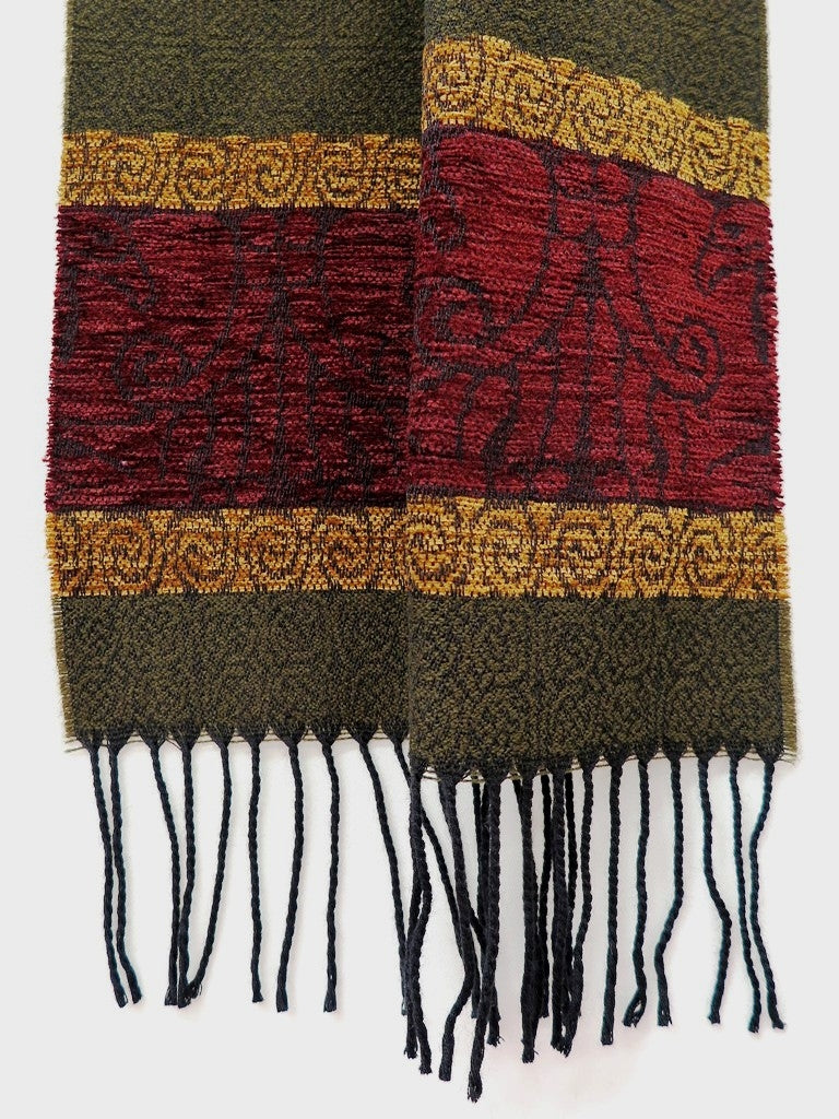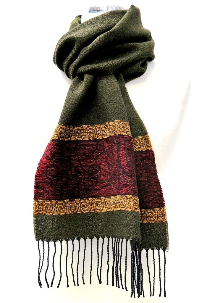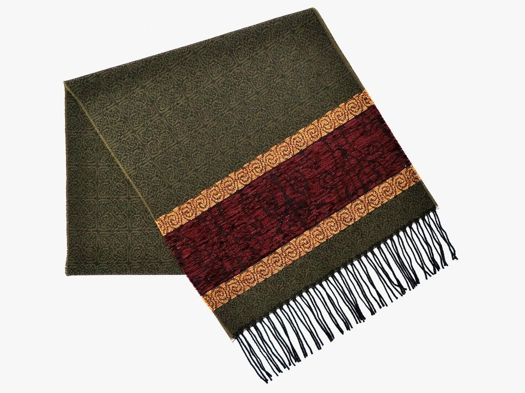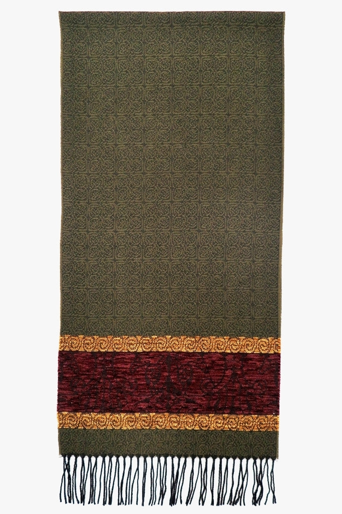 This beautiful scarf is woven in a gorgeous Olive green with a sumptuous Celtic chenille border in Burgundy and Gold.