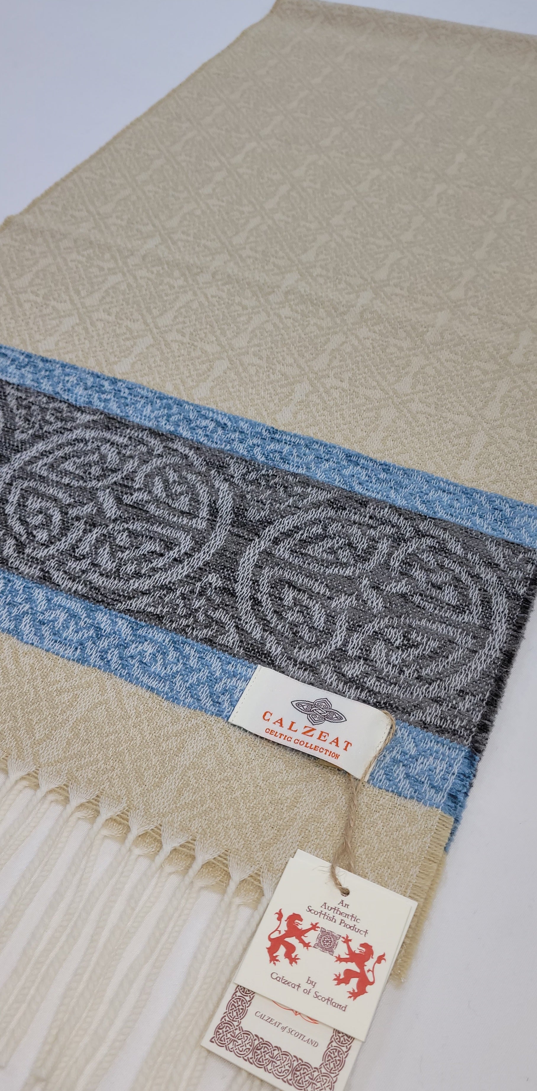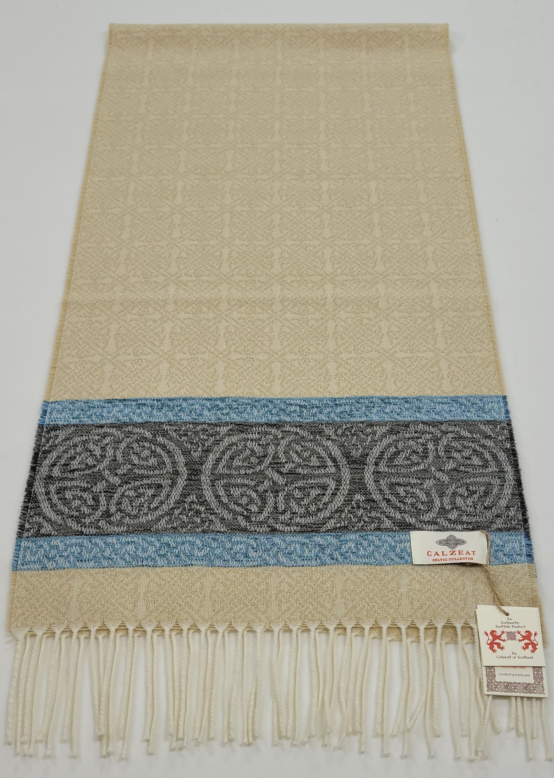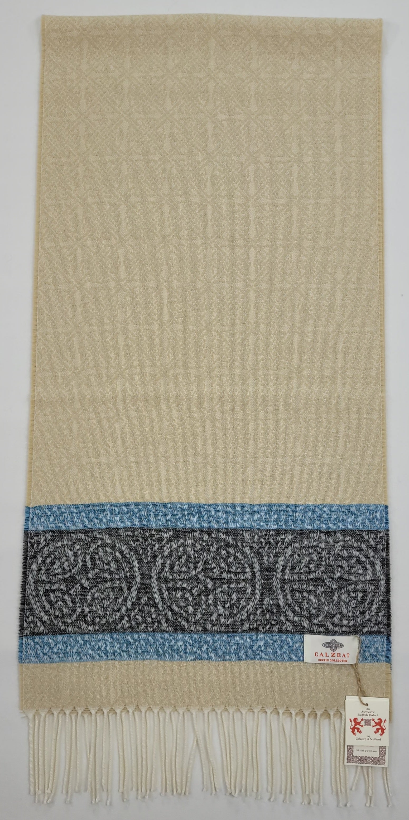 The Celtic Knot is the most recognised symbol in Celtic Art History.Circular Celtic Knots are a symbol of long life and eternity but are also recognized as a symbol of unity.The endless or mystical quality of Celtic Knots have been utilized in this scarf design to suggest infinity or time without end.Celtic Knot Meanings have always been very speculative.Contemporary scholars assumed however that the symbols represented basic tenants of life, mankind and spirituality.An authentic Scottish product exclusively designed and woven by Calzeat of Scotland.