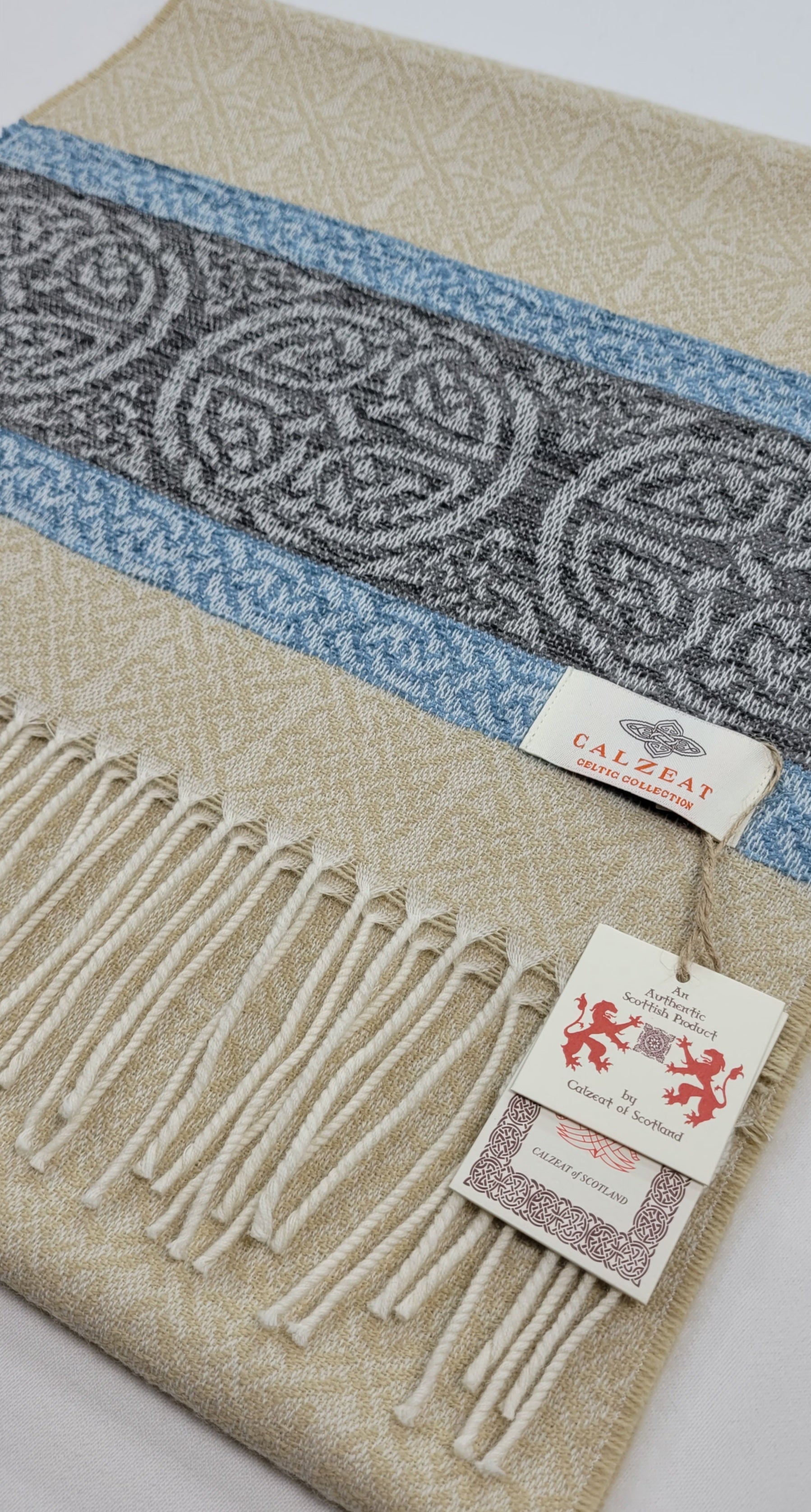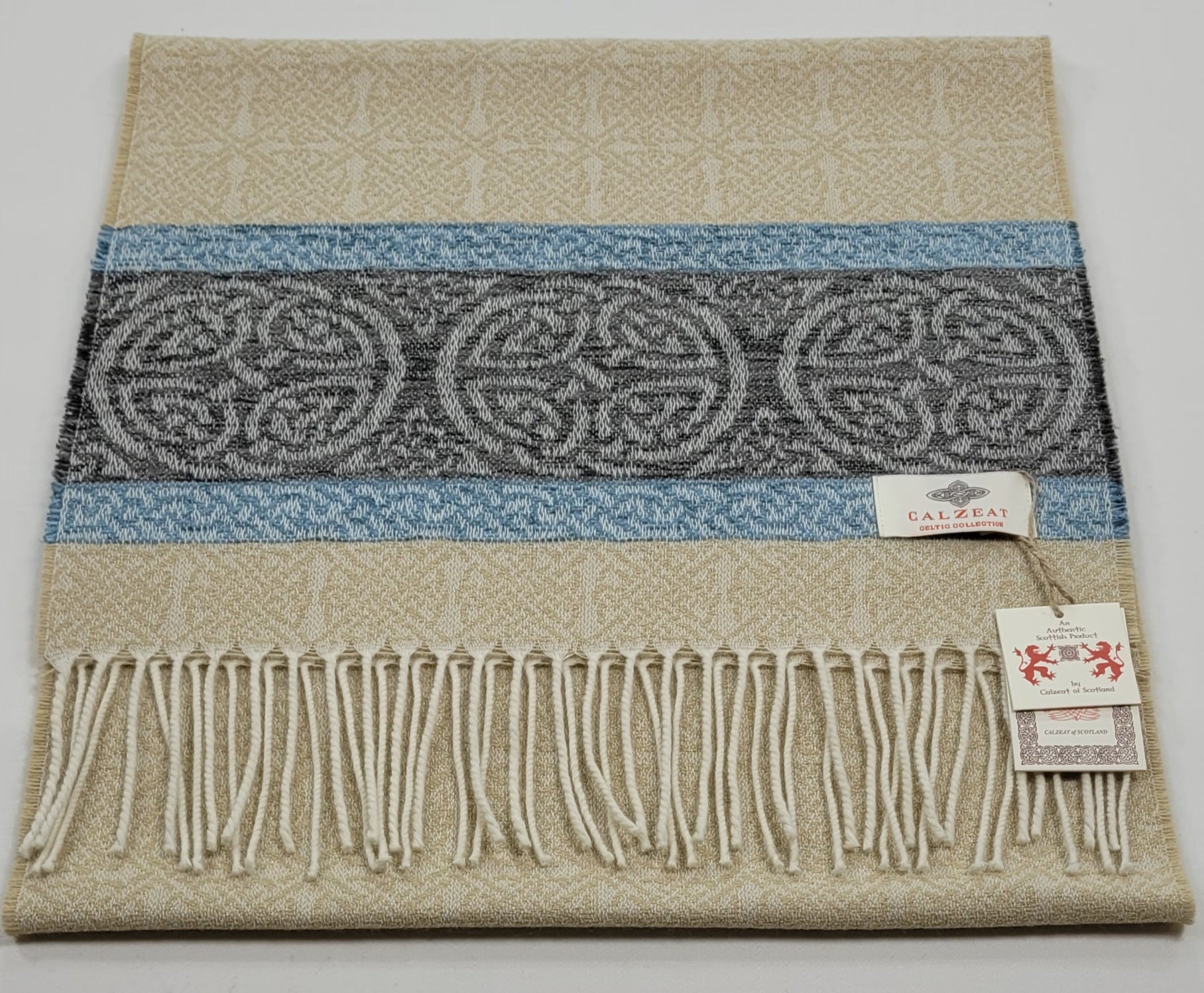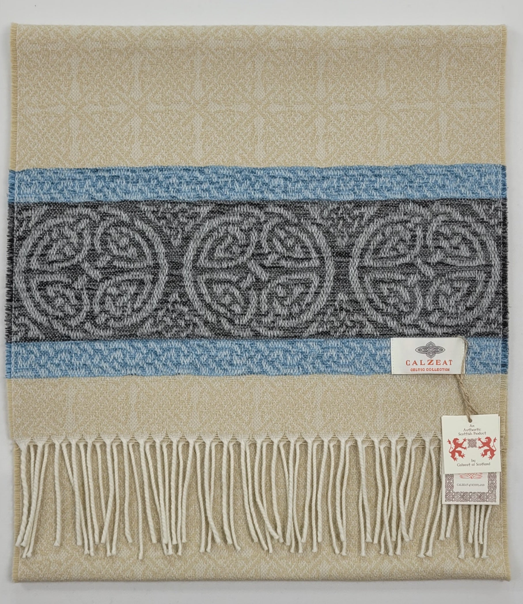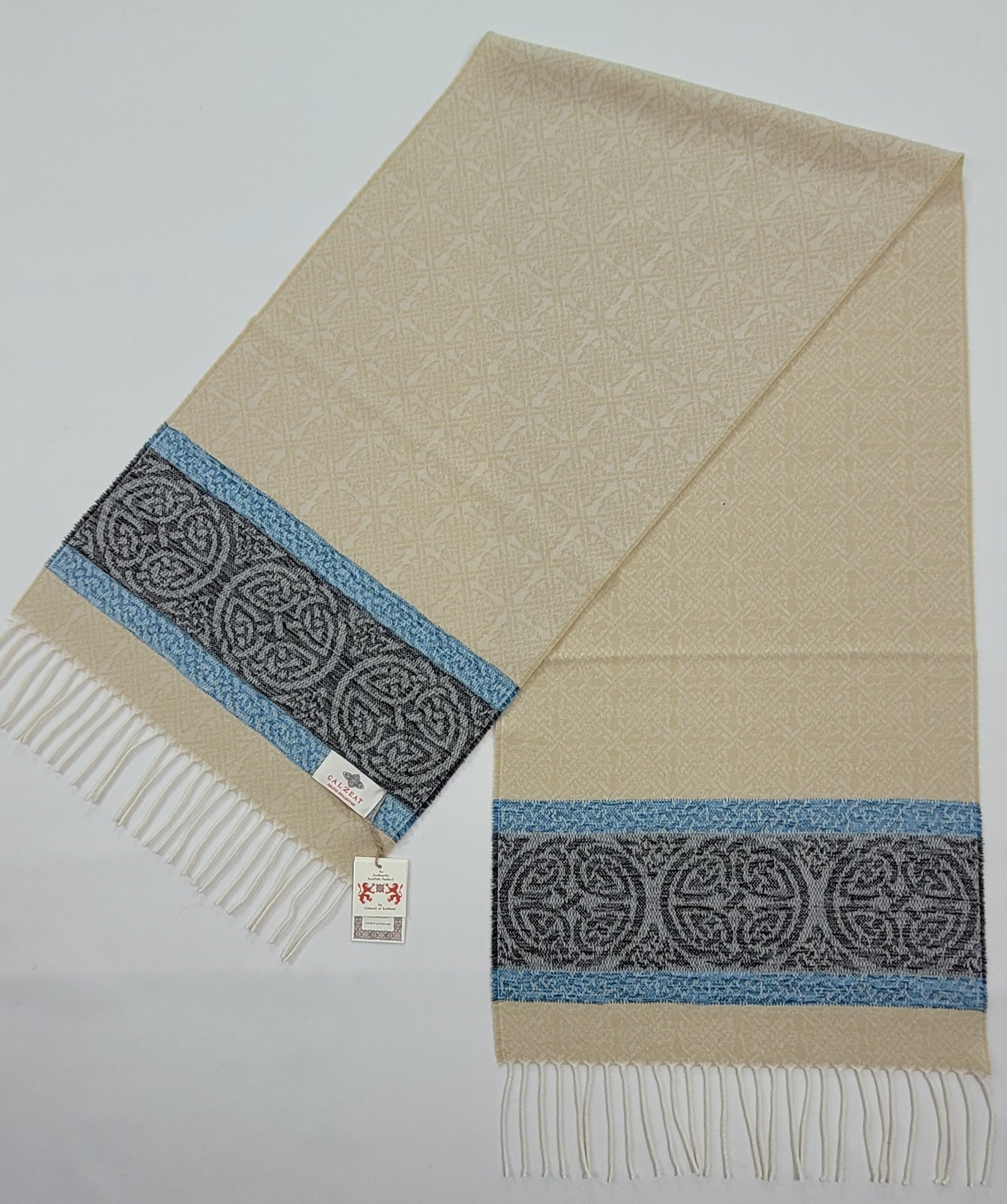 The Celtic Knot is the most recognised symbol in Celtic Art History.Circular Celtic Knots are a symbol of long life and eternity but are also recognized as a symbol of unity.The endless or mystical quality of Celtic Knots have been utilized in this scarf design to suggest infinity or time without end.Celtic Knot Meanings have always been very speculative.Contemporary scholars assumed however that the symbols represented basic tenants of life, mankind and spirituality.An authentic Scottish product exclusively designed and woven by Calzeat of Scotland.