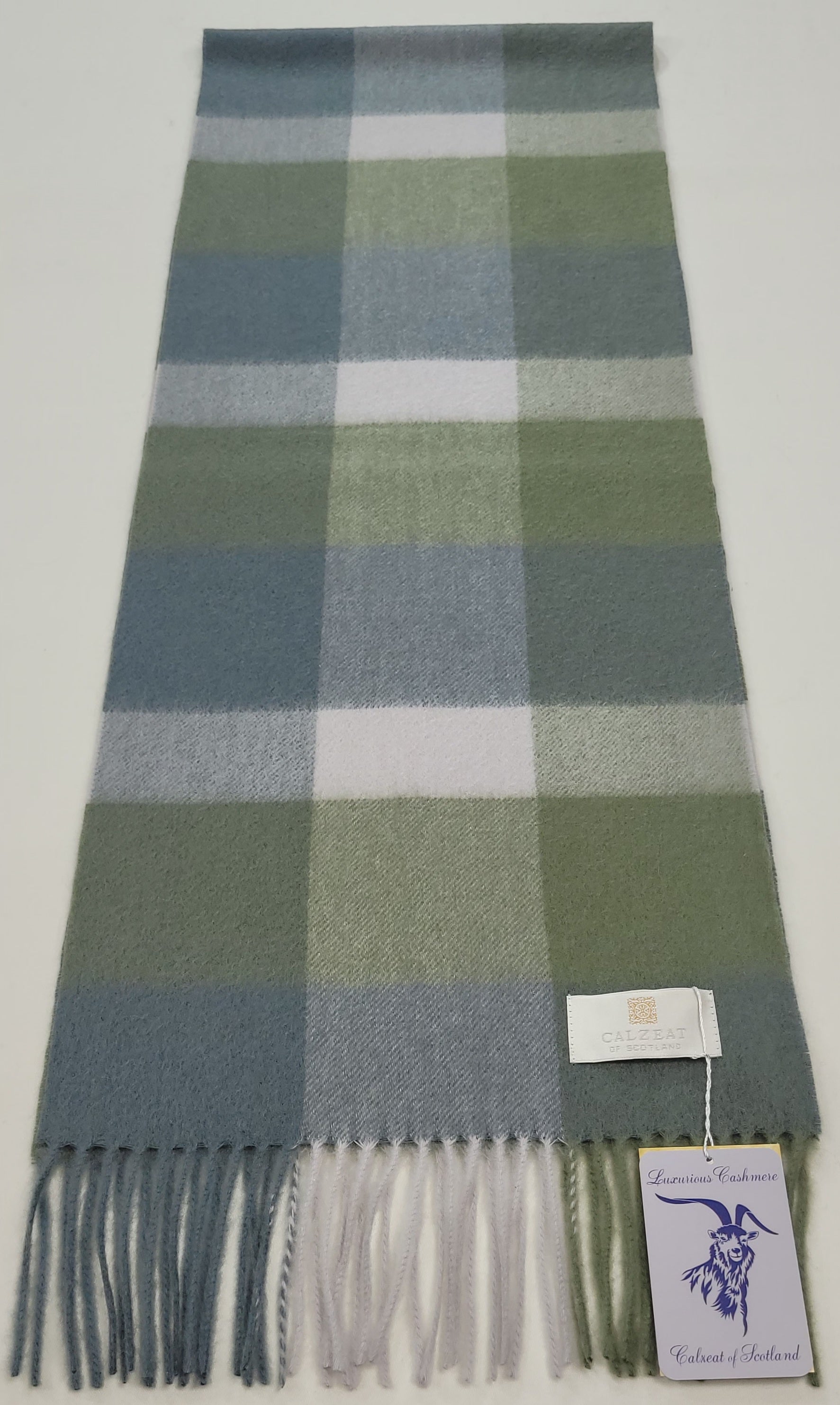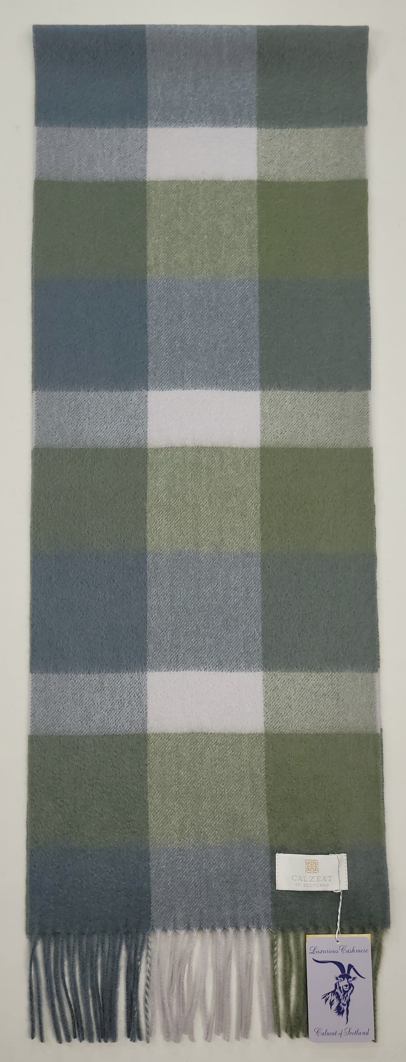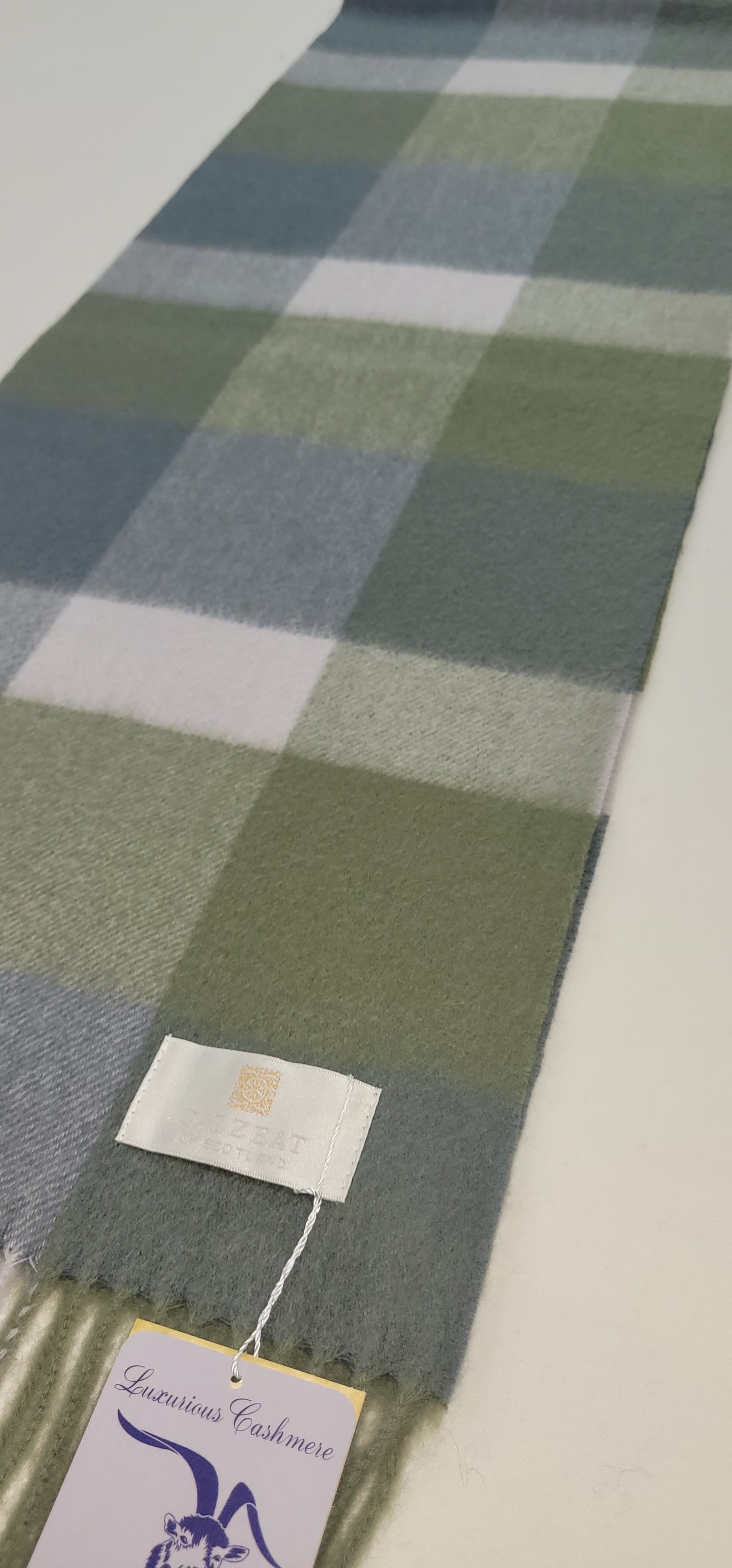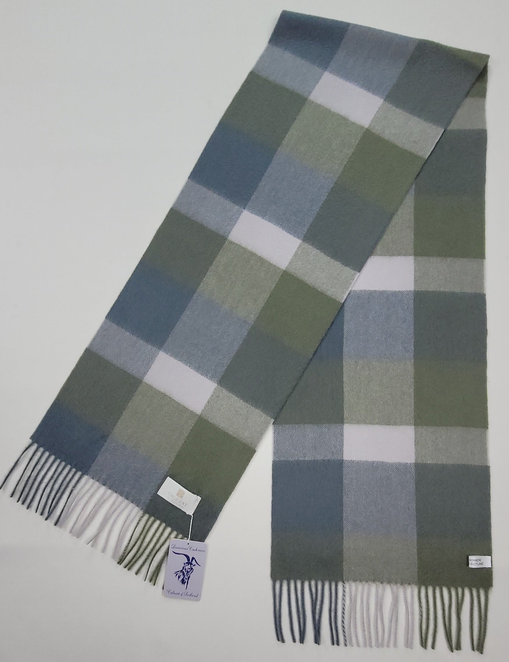 This pure cashmere scarf in shades of Green and Grey and White is a classic and timeless design perfect for both men and women alike. Dimensions: 180 x 30 cms Composition: 100% Cashmere Made in Scotland |